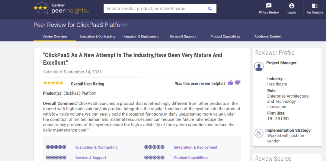Tips:::::::::::::【Peer Insights】——用户对企业IT产品和服务发布真实评价的平台。。。。。目前已有355个市场,,,,,,,,,,,,,,,,255,000条经过验证的评价。。。。。。。。。。。。每一条评价Gartner会针对参评企业营收规模及参评人员信息做验证、、、、、评价内容做多维核实。。。。。。。。。。。。。。